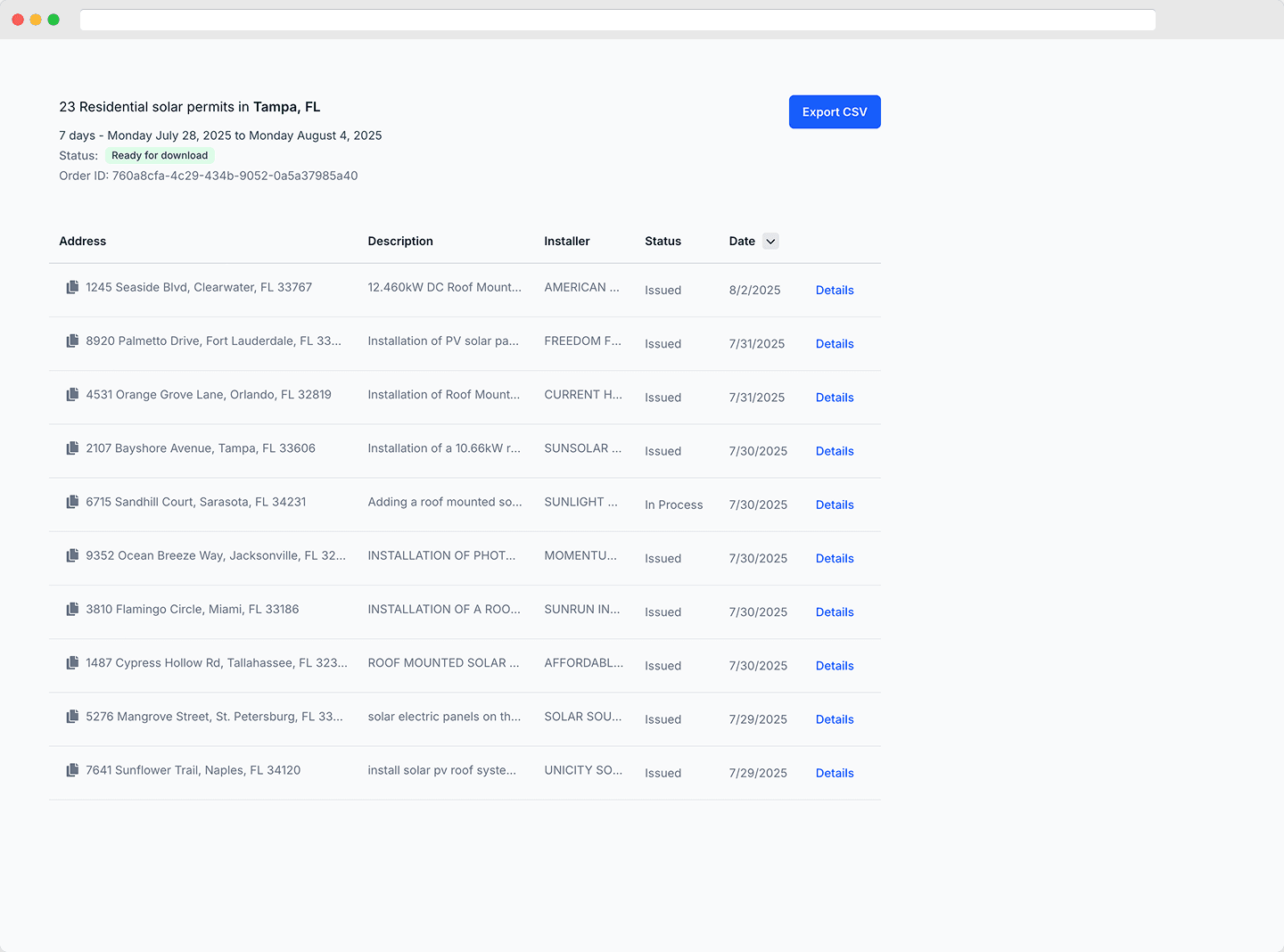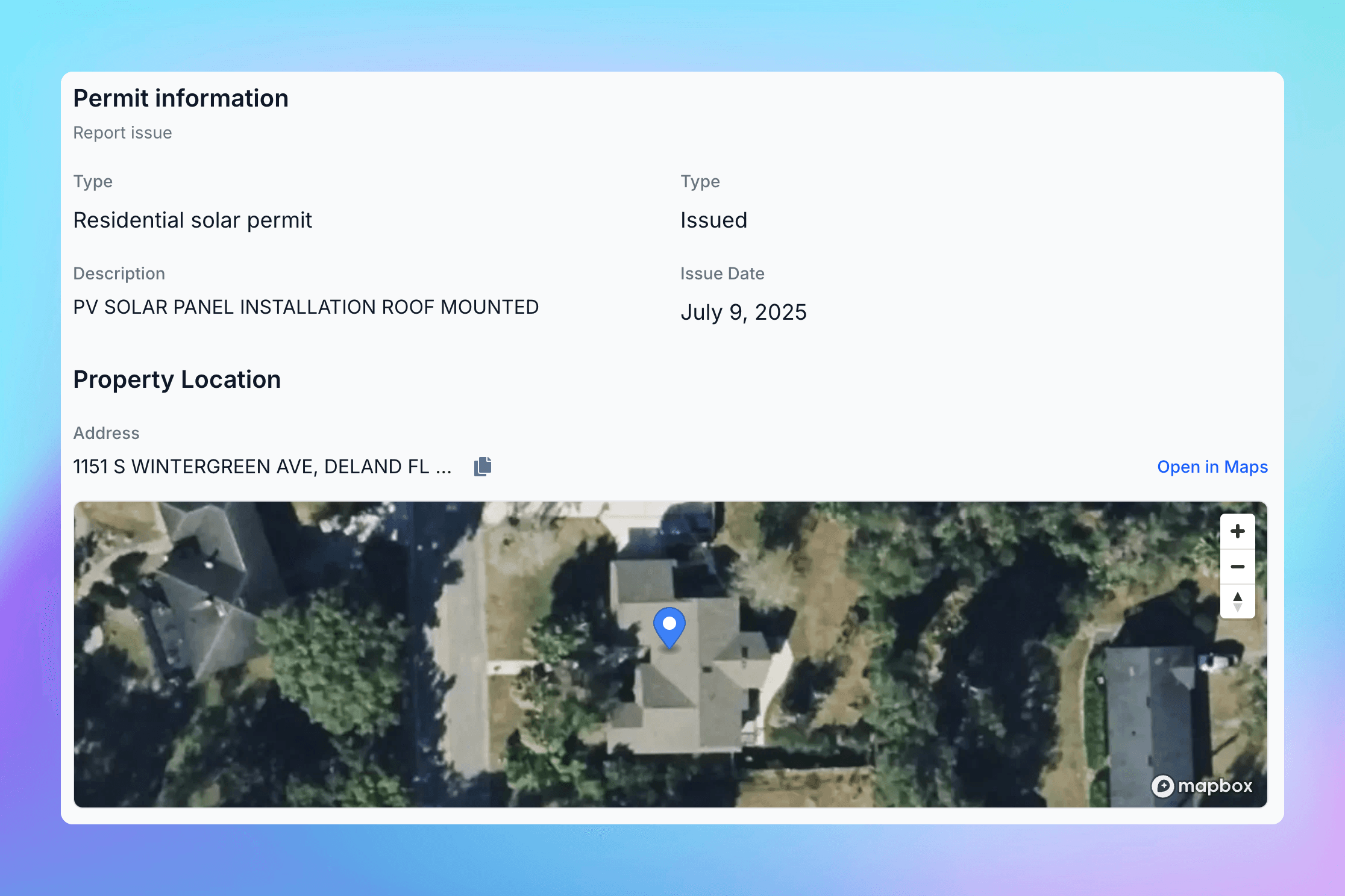 Discover the latest solar, HVAC, & roofing permits in your market — with full project and contact details so you can follow up before your competition.